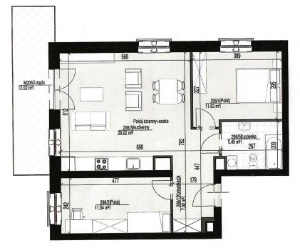 – salon z aneksem kuchennym oraz klimatyzacją i wyjściem na balkon (28,02 m²)