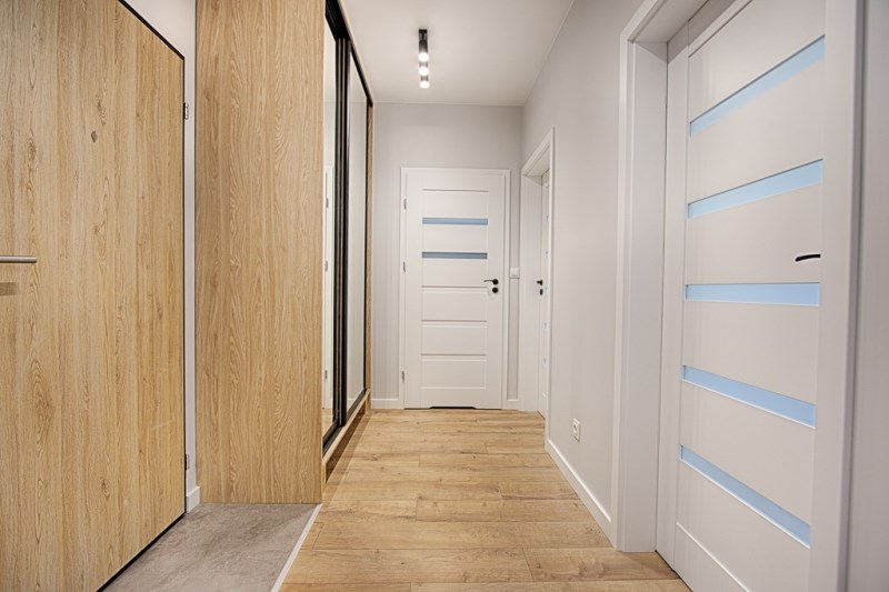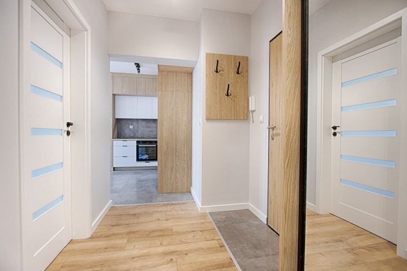 Kuchnia została wykonana w zabudowie na wymiar i wyposażona w sprzęt AGD (lodówka, zmywarka, piekarnik, płyta indukcyjna) – wszystkie urządzenia objęte są gwarancją. W przedpokoju znajdują się funkcjonalne szafy w zabudowie, zapewniające wygodę przechowywania.